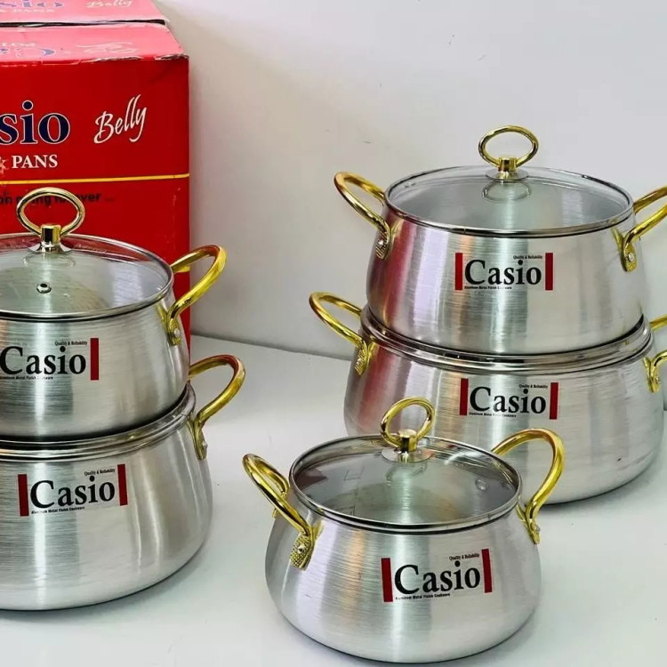 سرویس۱۰پارچه کاسیو براق دسته طلایی سایز 26-28-20-22-24 جنس آلومینیوم- درب پیرکس