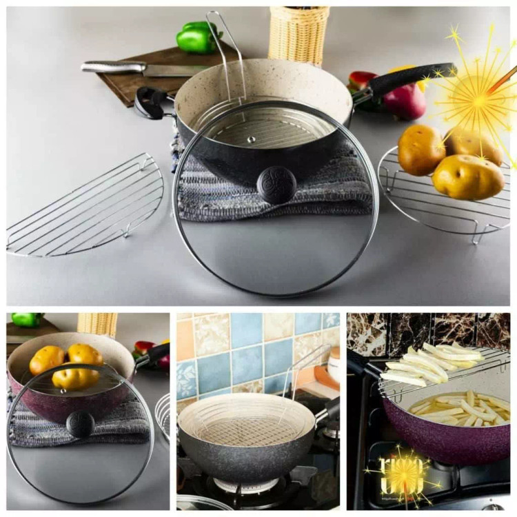 تابه ووک ۵پارچه تابه دو دسته درب پیرکس سبد رو غن گیر سبد سرخ کن سبد بخارپز داخل گرانیت ۱۰۰٪ نچسب