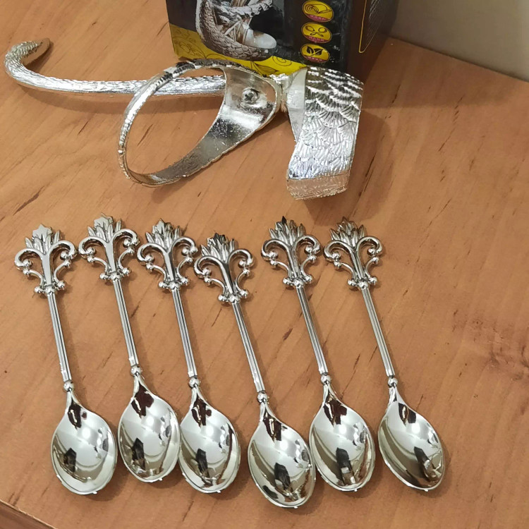 قاشق چای خوری طرح قوقلم کاری شده 6تایی به همراه استند زیبا رنگ ثابت نقره ای